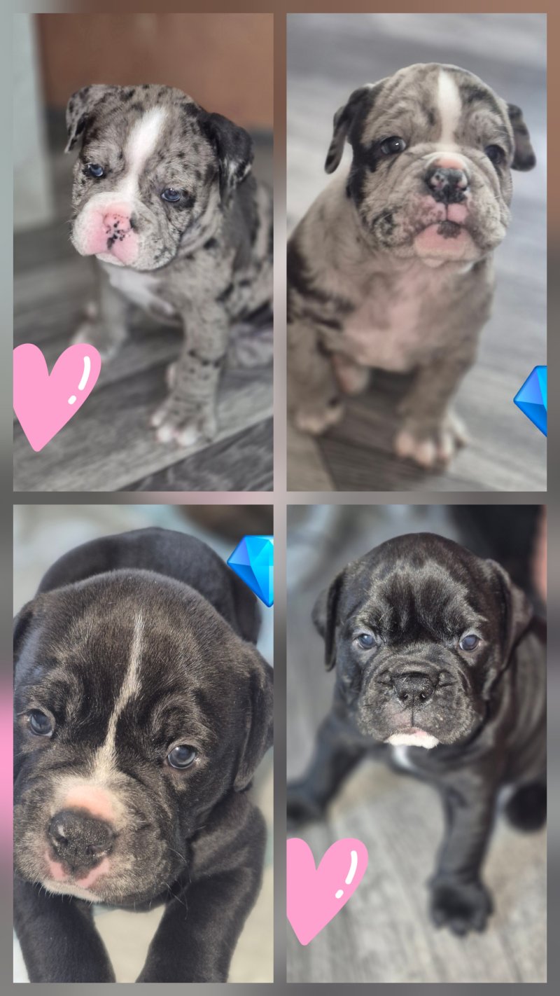 5 Old English Bulldogs Pups born 4th Aug . Beautiful rainbow litter . Wormed , will be microchipped, NEBBR registered and first set of vaccinations will be done before they leave for their forever homes . Well socialised, fab addition to any family . Both Mum and Dad are our family pets.