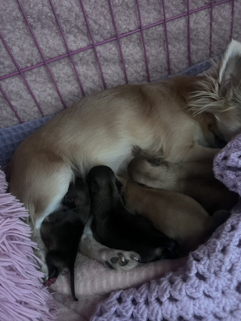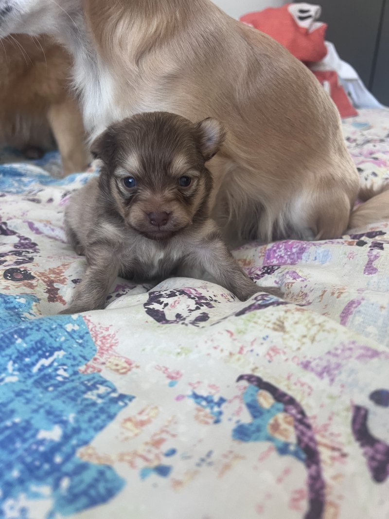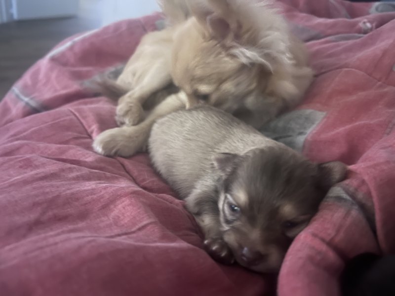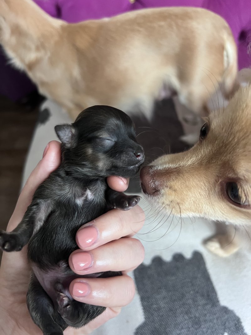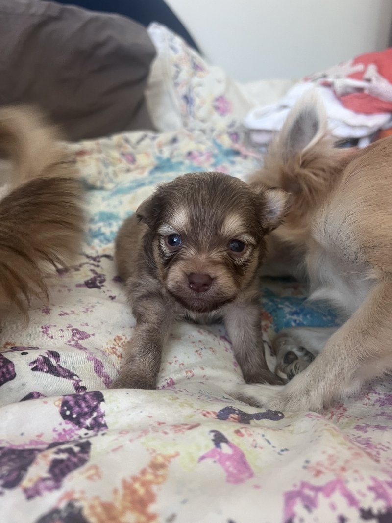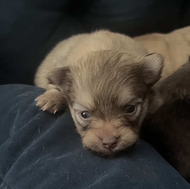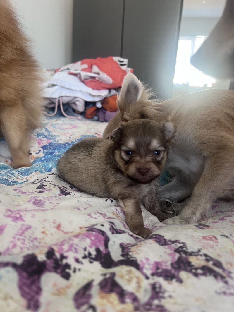 I have three healthy pomchi puppies all three male the mum is a Chihuahua and the father is a Pomeranian both family pets so can be seen with the puppies. Puppies have already been vet checked and will be again just before they go home. They’ll be going home with a blanket with their mum. Smell on some toys and a bag of food.