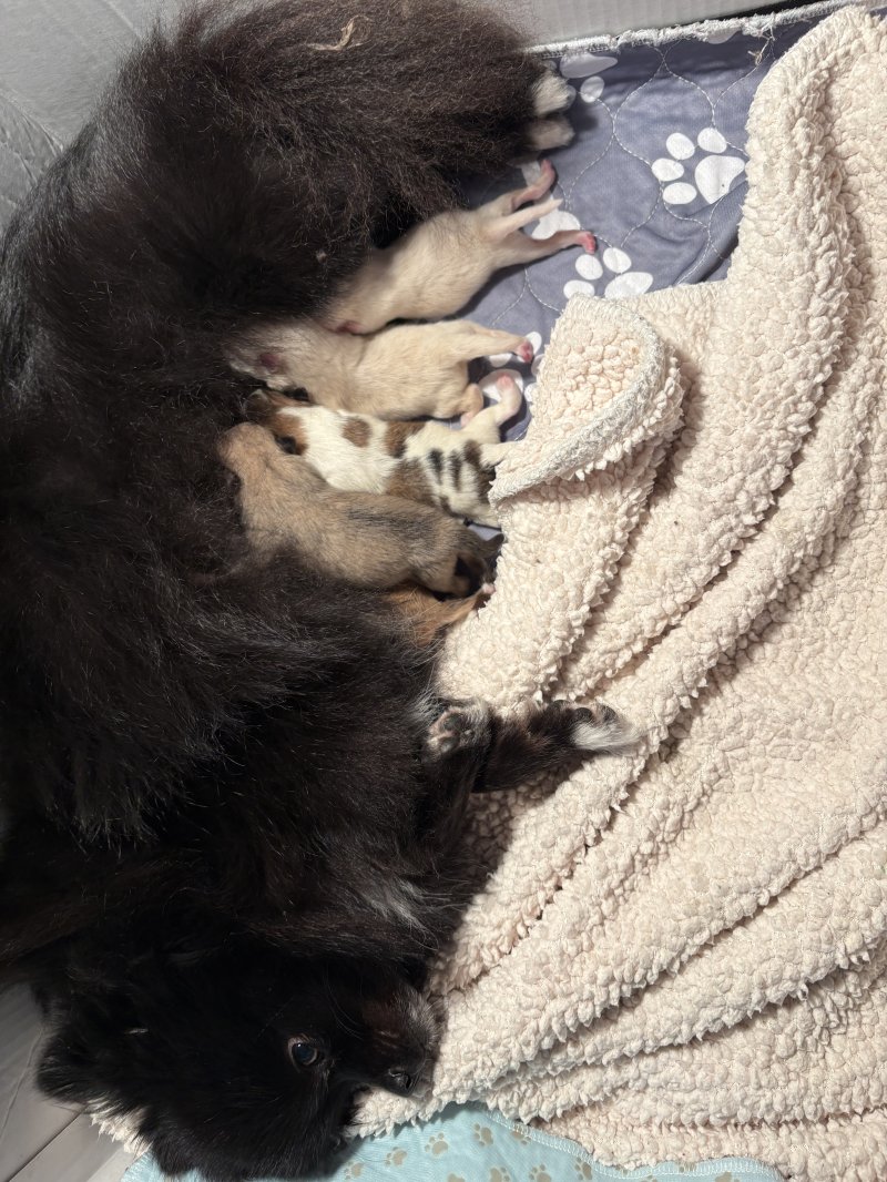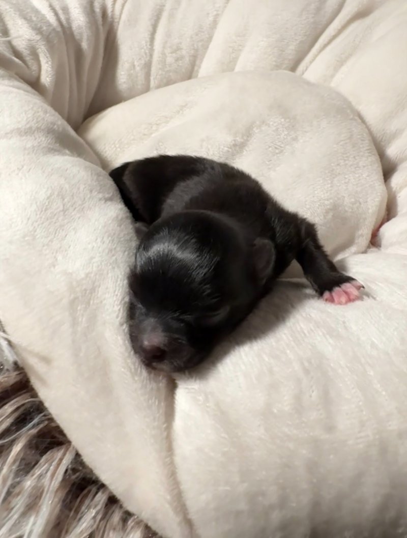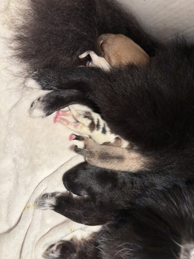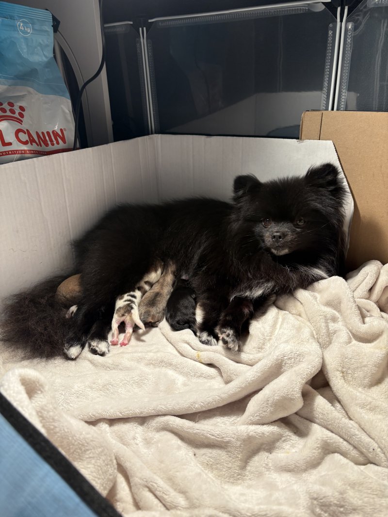 Mother - Bonnie, Black Pomeranian with white socks and white chest. Weighing only 3kg, from Champion Russian & Chi Tien lines. Carries Ice White, Chocolate, Chocolate & Tan Gene Colours. She has an amazing temperament, very happy, friendly, playful, loving and smart.