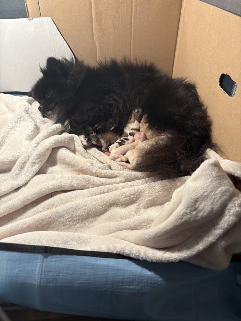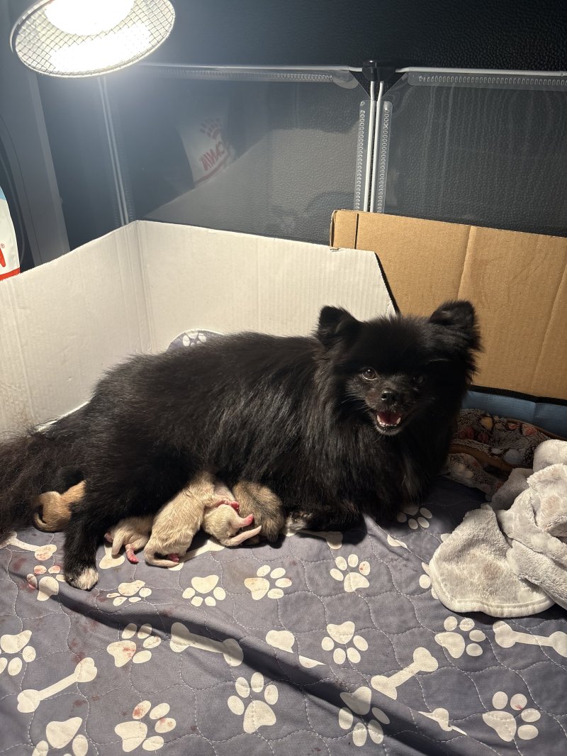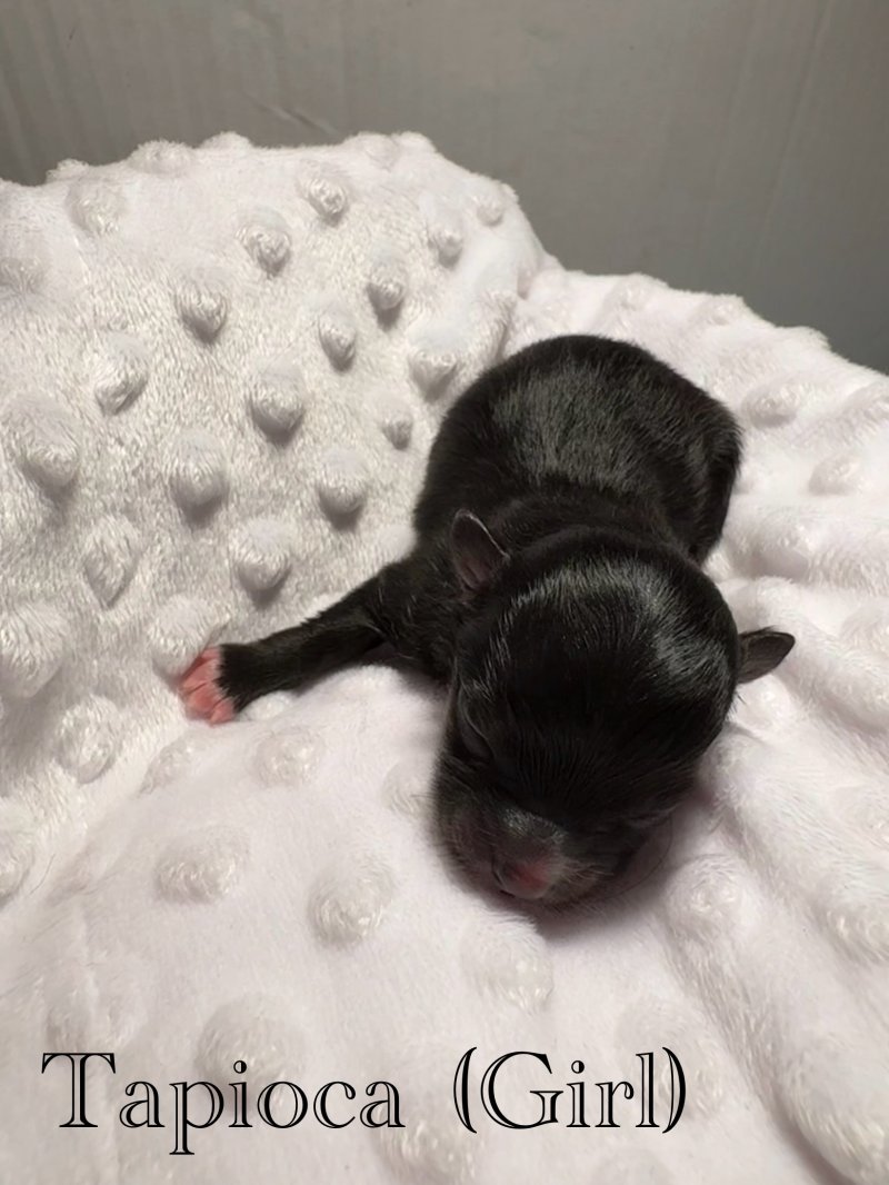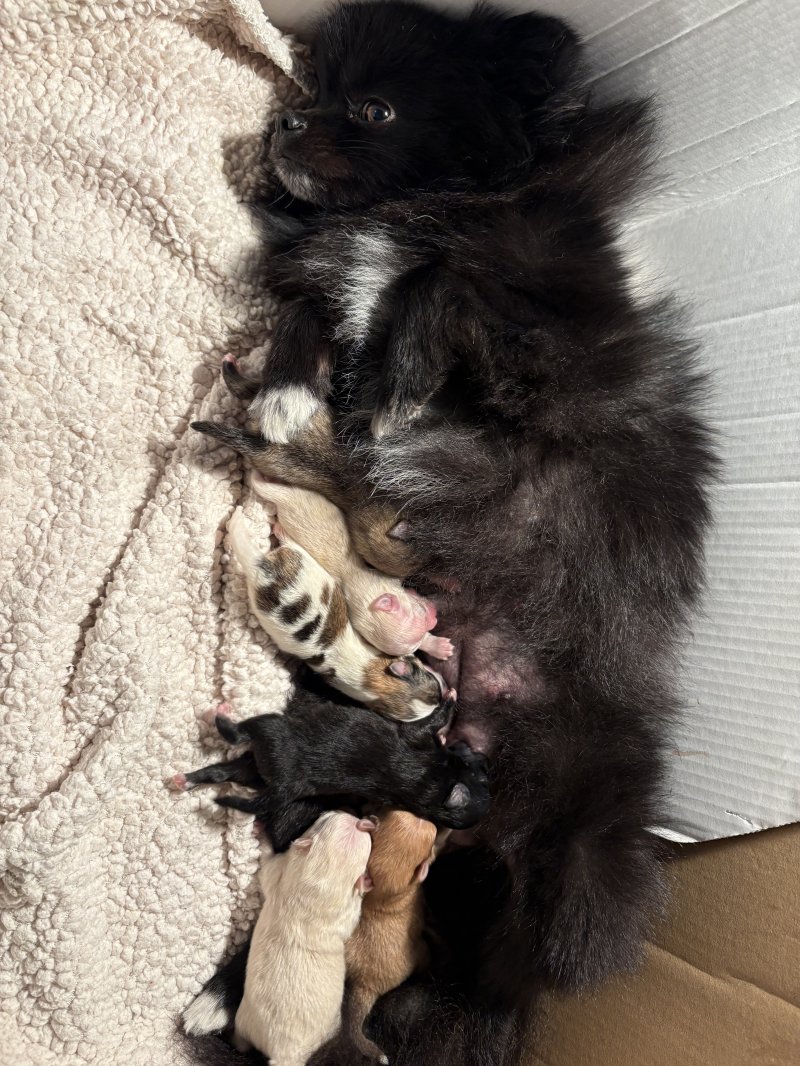 Mother - Bonnie, Black Pomeranian with white socks and white chest. Weighing only 3kg, from Champion Russian & Chi Tien lines. Carries Ice White, Chocolate, Chocolate & Tan Gene Colours. She has an amazing temperament, very happy, friendly, playful, loving and smart.
