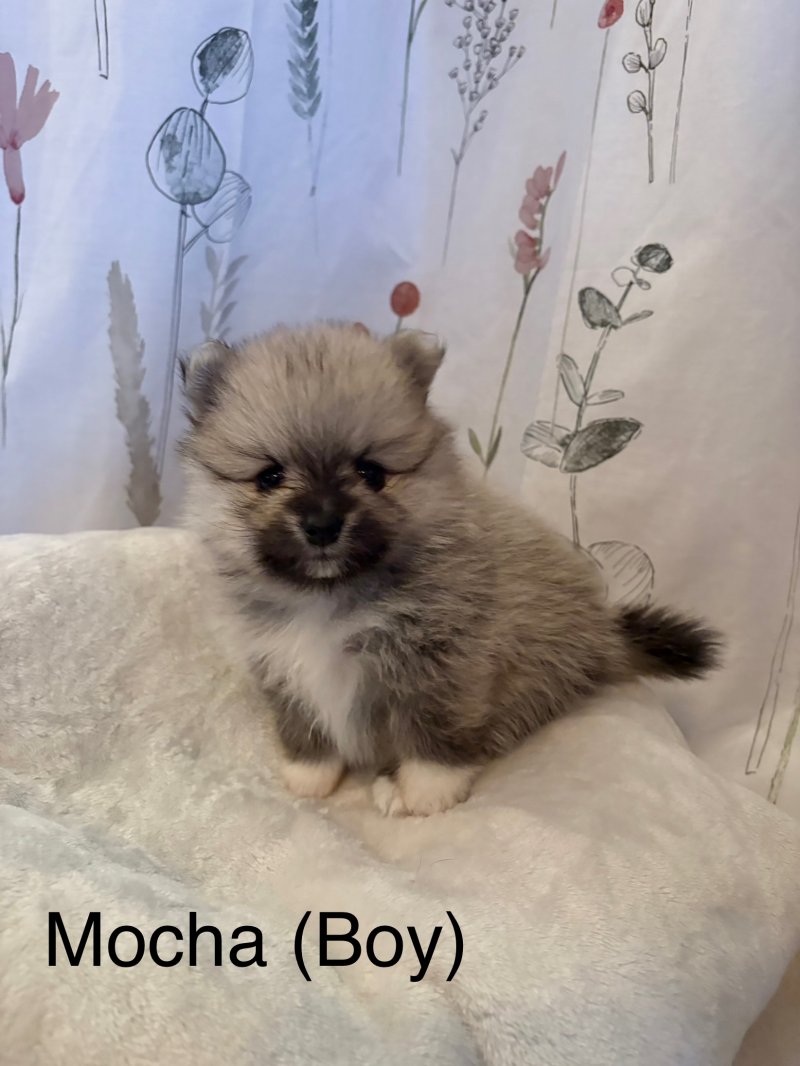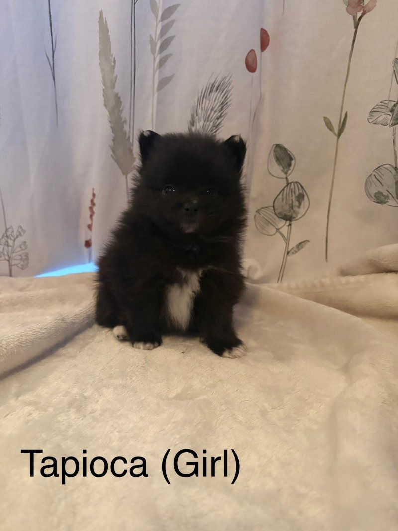 Mother - Bonnie, Black Pomeranian with white socks and white chest. Weighing only 3kg, from Champion Russian & Chi Tien lines. Carries Ice White, Chocolate, Chocolate & Tan Gene Colours. She has an amazing temperament, very happy, friendly, playful, loving and smart.