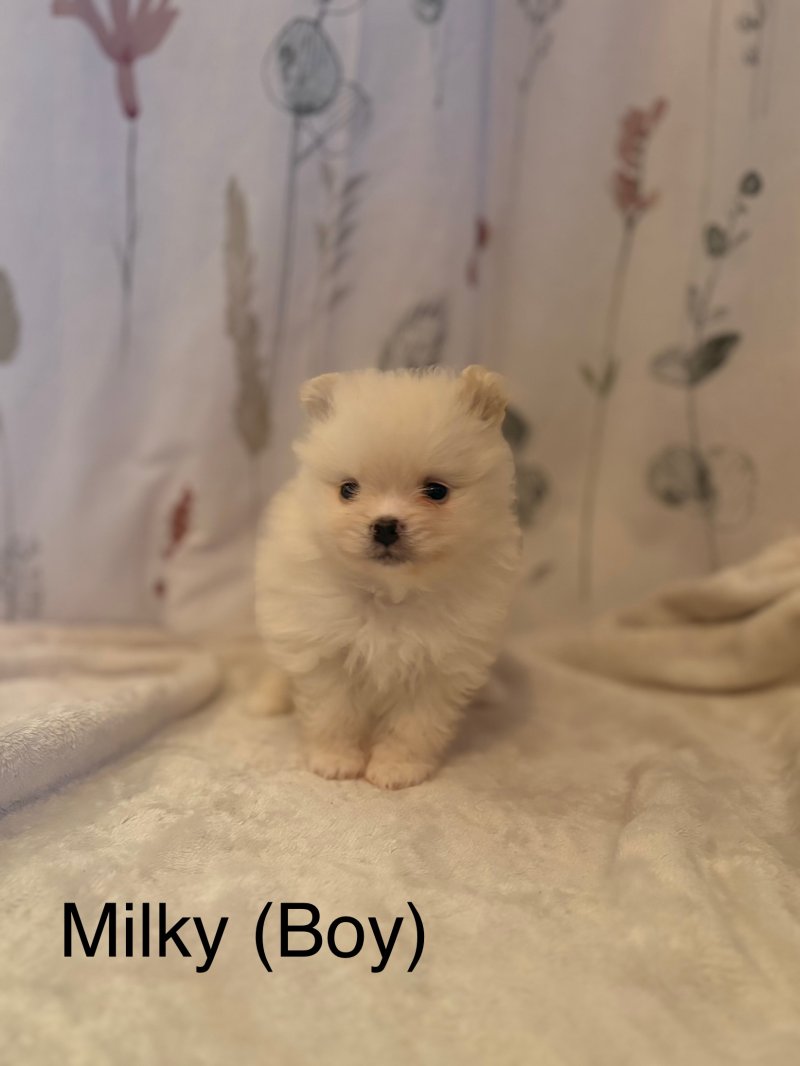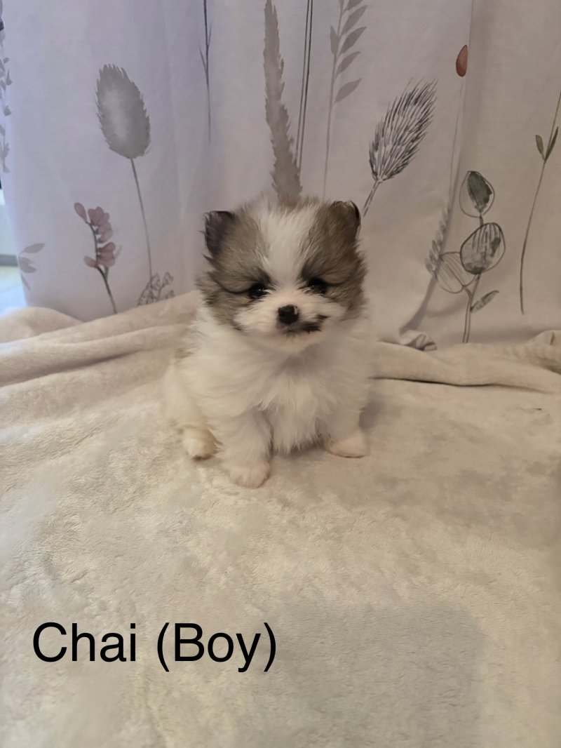 Father - Yogi, Parti Pomeranian (White and Orange). Weighing 1.3kg, imported, from champion Russian & Chi Tien lines. Carries Parti, White, Cream, Chocolate, Tan, Black & Tan, Sable Gene Colours. He has an amazing temperament, very happy, friendly and loving - a true gentleman.