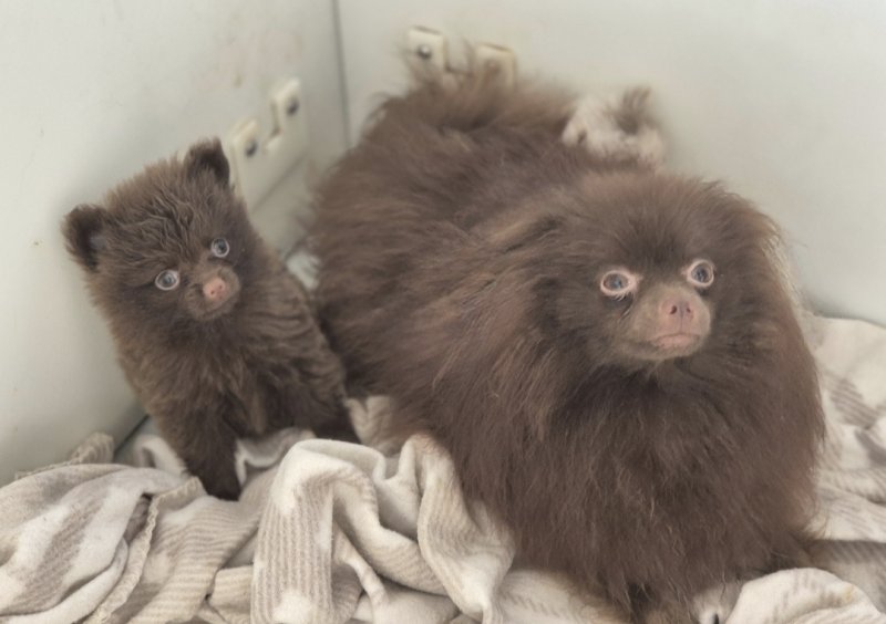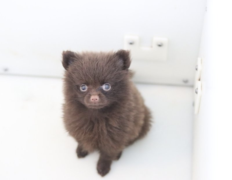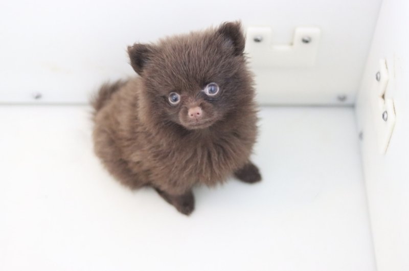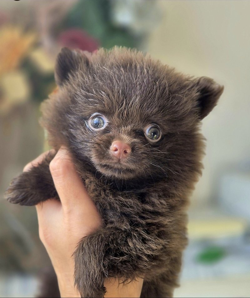 One chocolate pomeranian with green eyes available! From a litter of two.