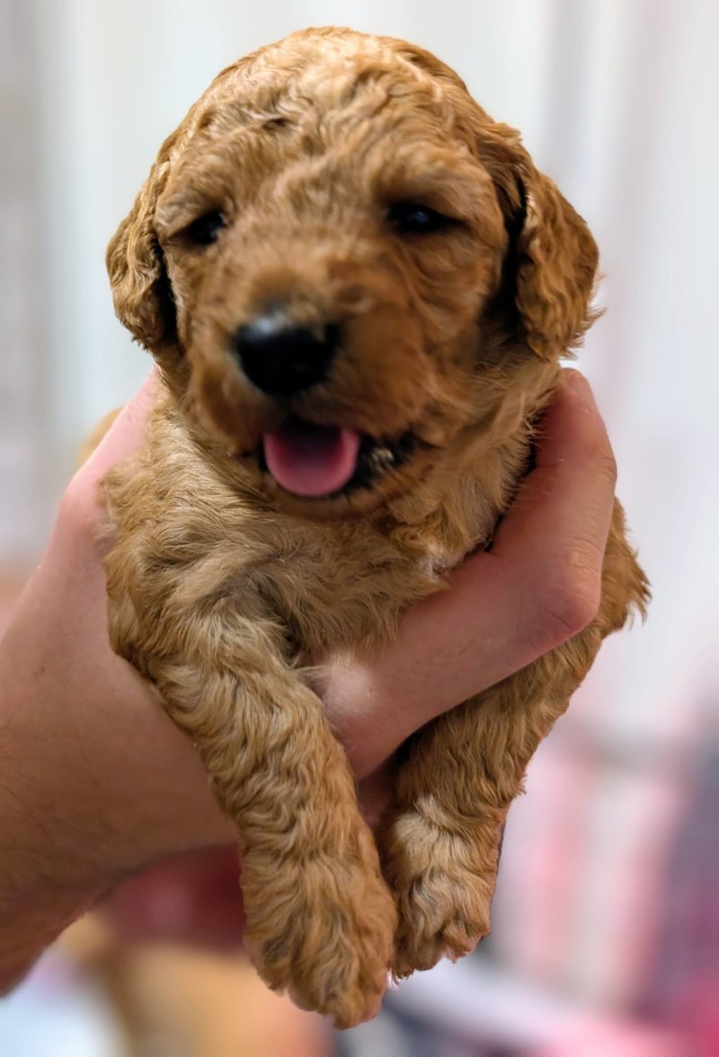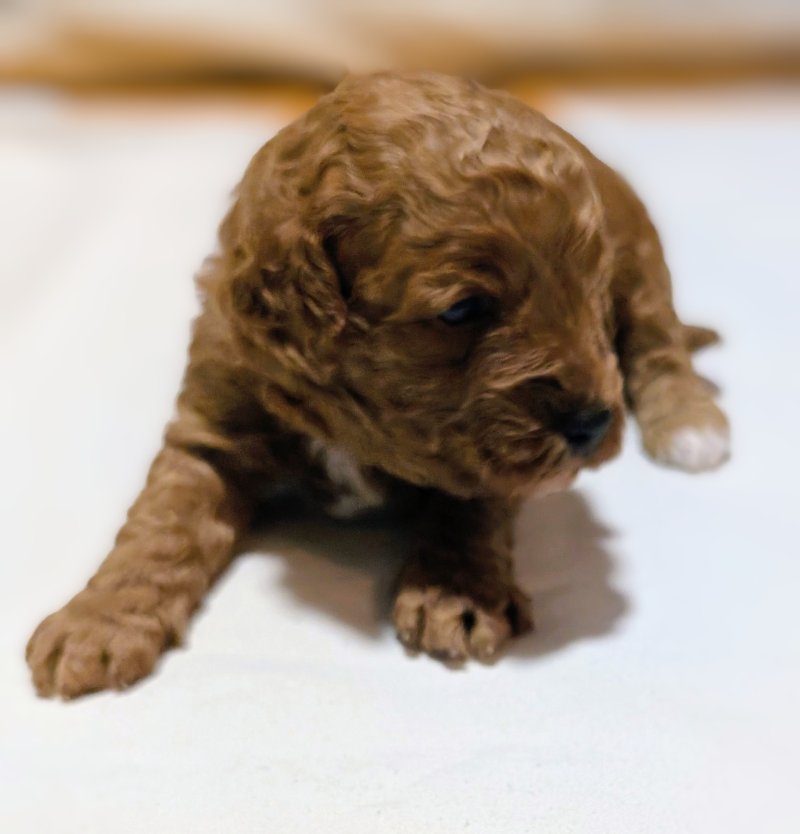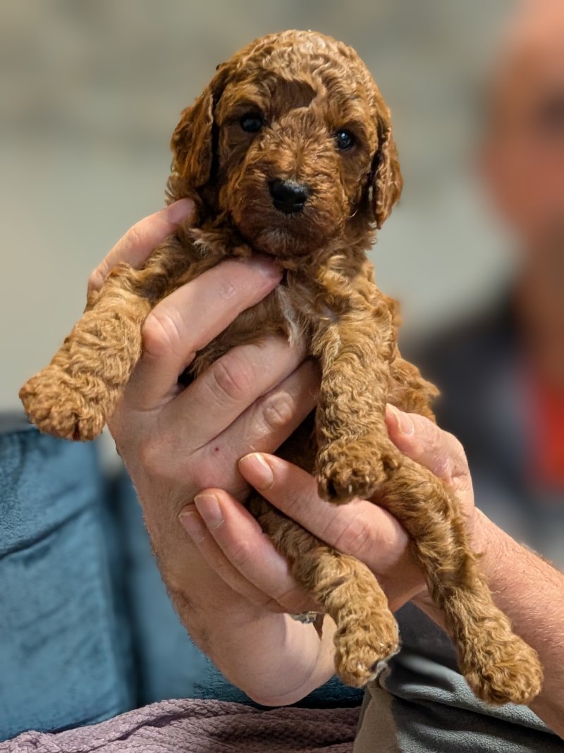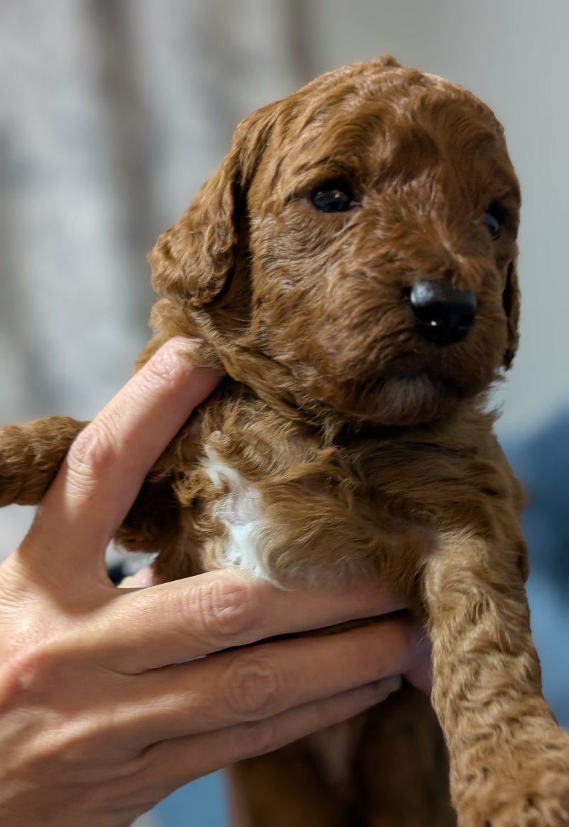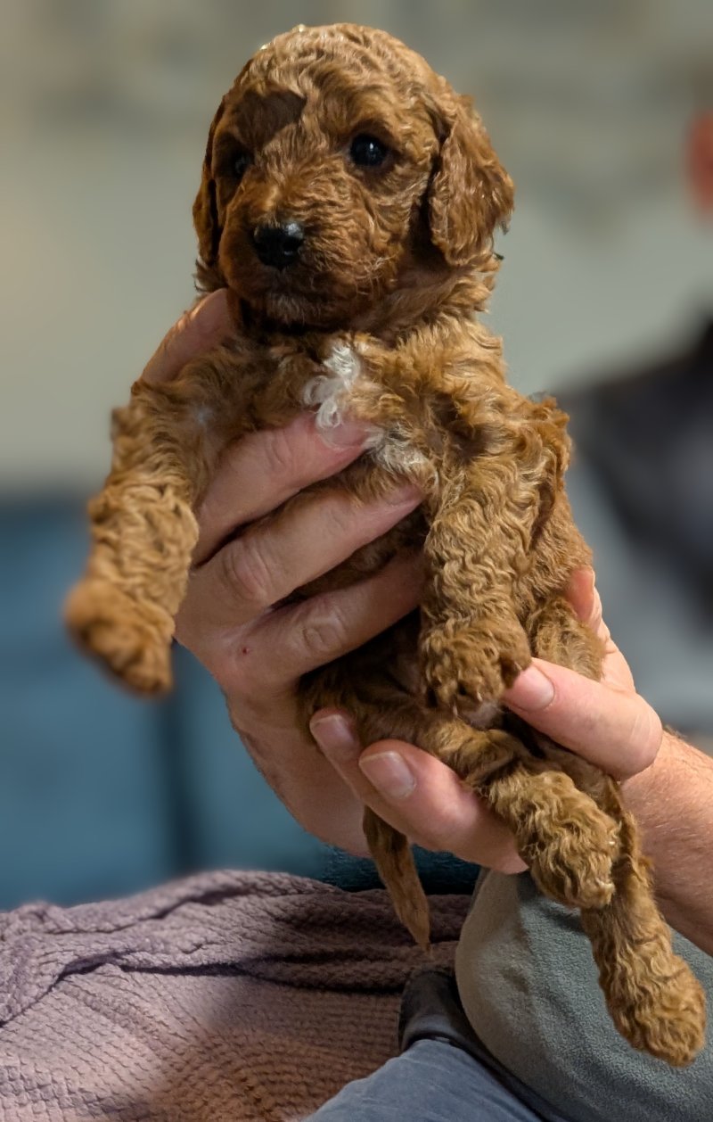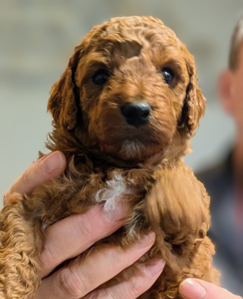 Dad, “Gino” is a local KC registered miniature poodle stud dog. He is red with some white markings on his chest. He has a proven track record or sired puppies . We are informed, he too has a wonderful temperament and has sired many healthy litters.