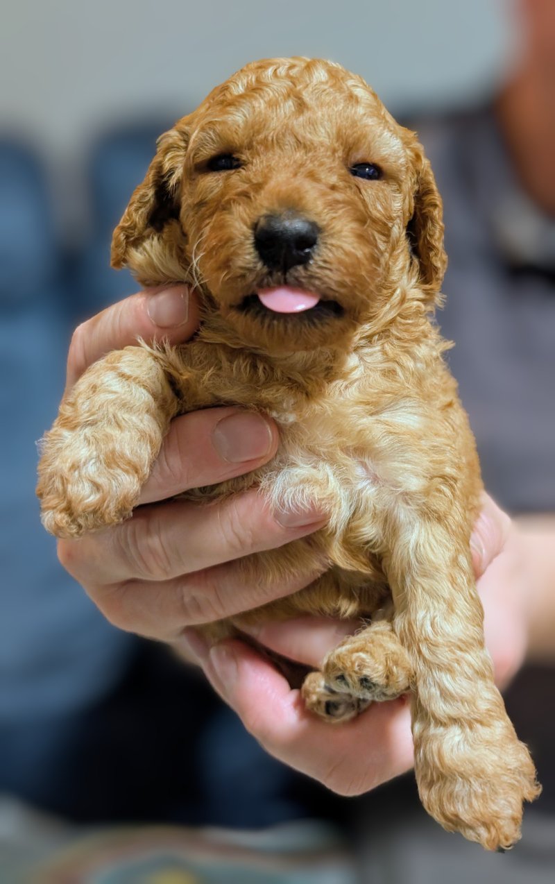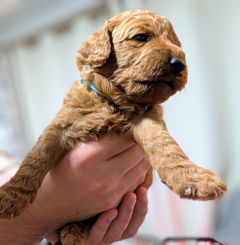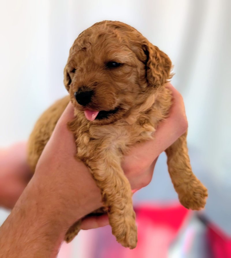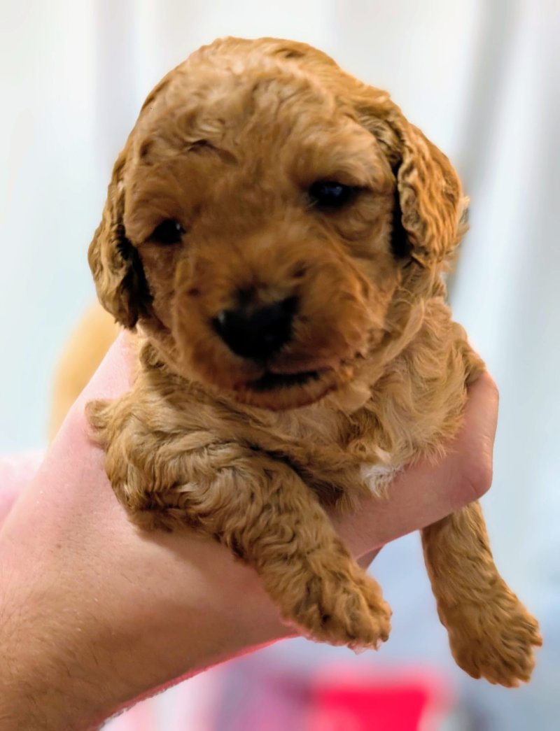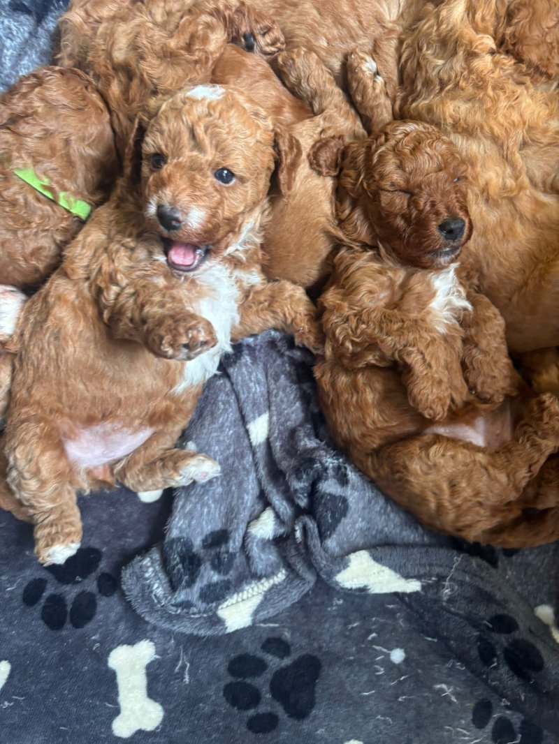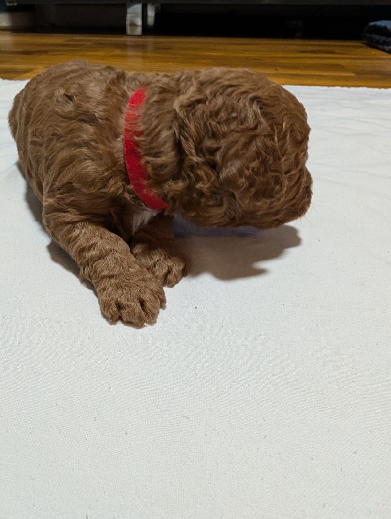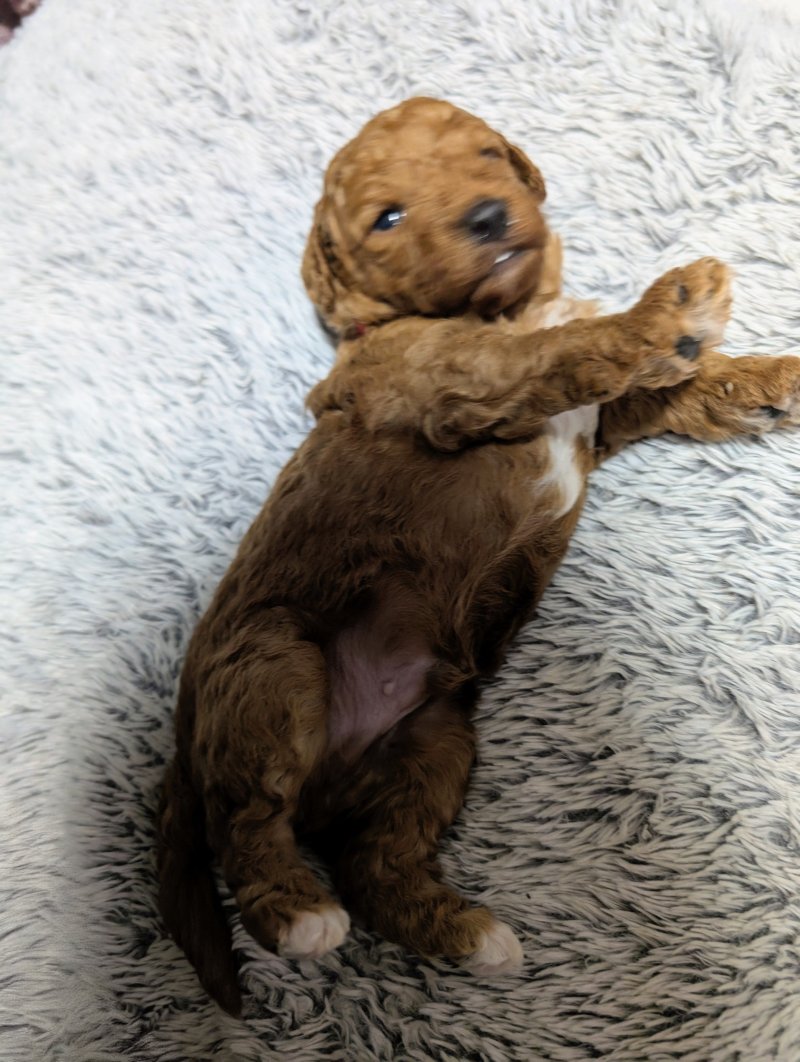 Dad, “Gino” is a local KC registered miniature poodle stud dog. He is red with some white markings on his chest. He has a proven track record or sired puppies . We are informed, he too has a wonderful temperament and has sired many healthy litters.