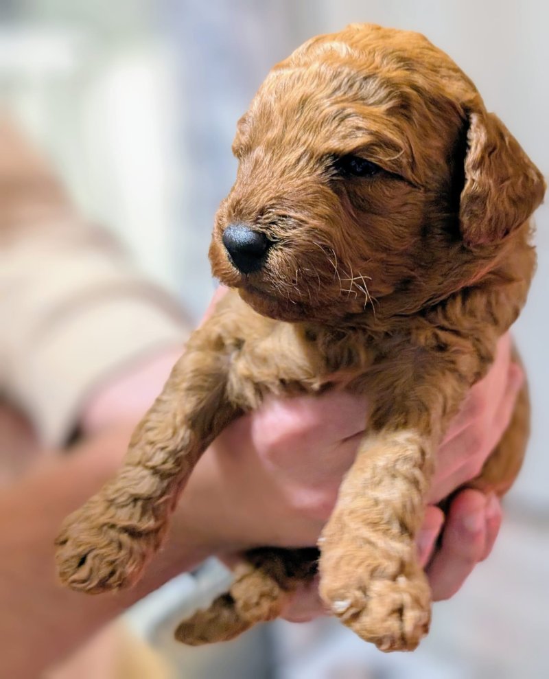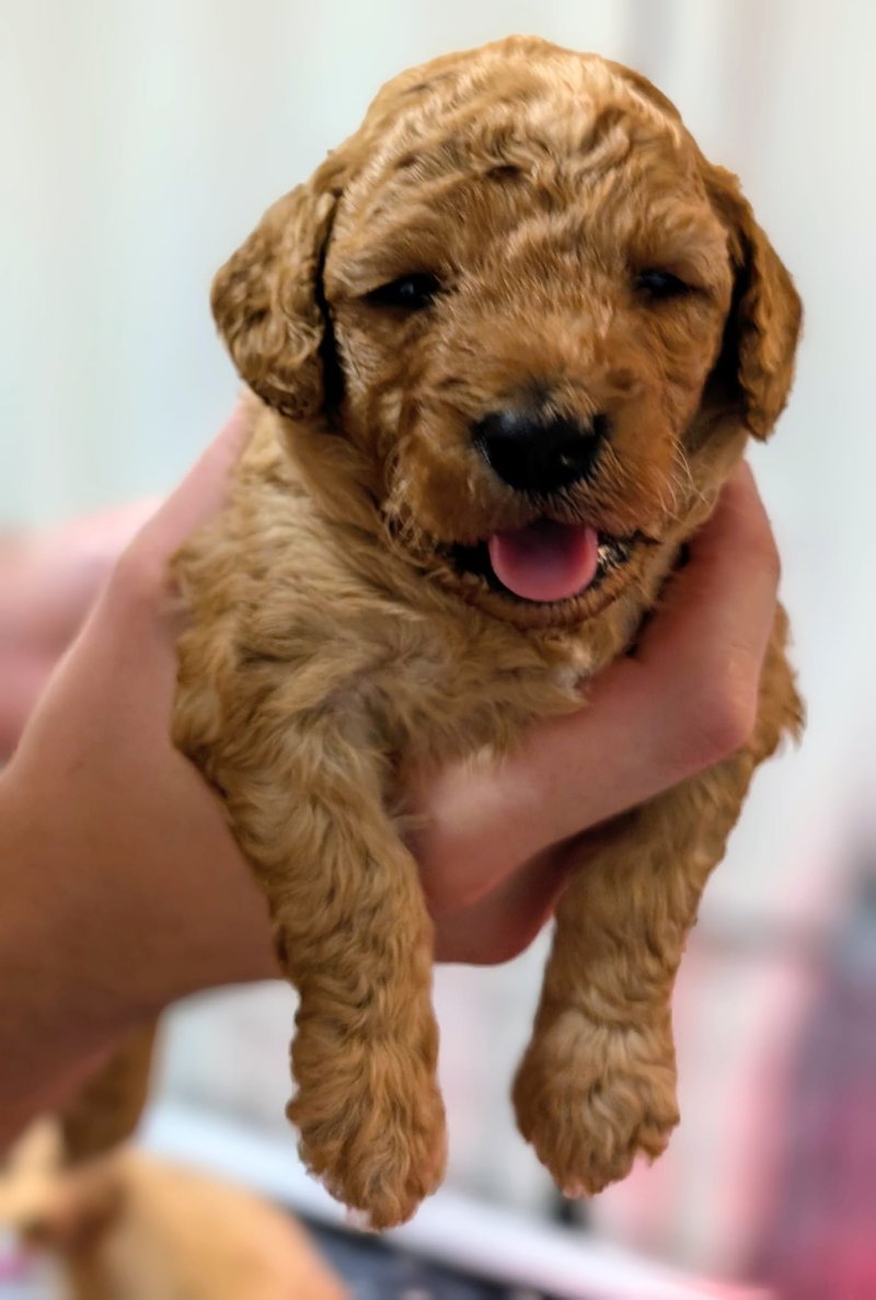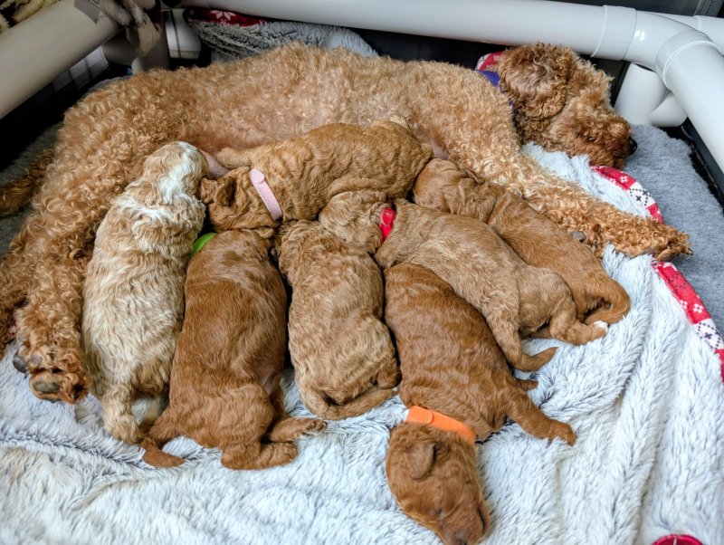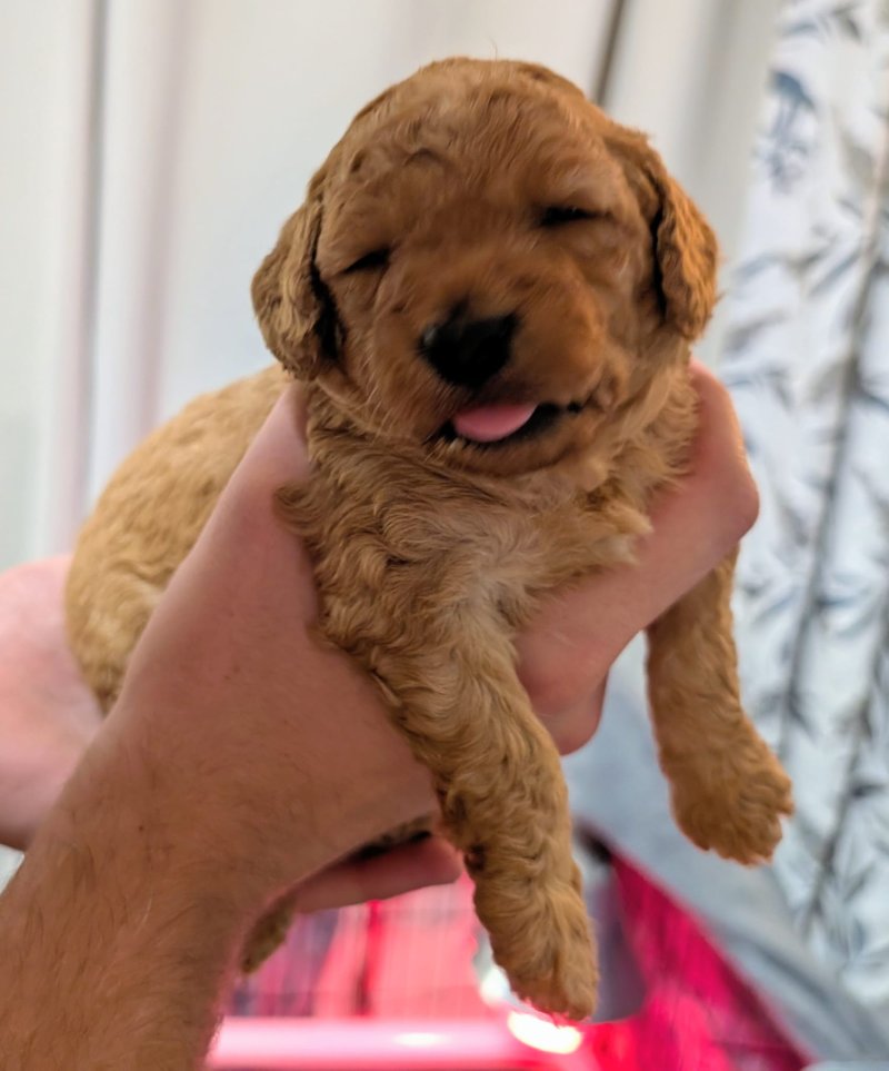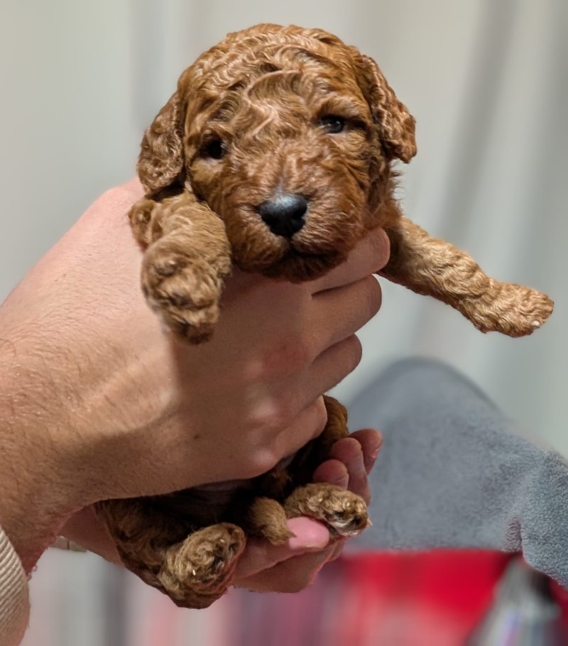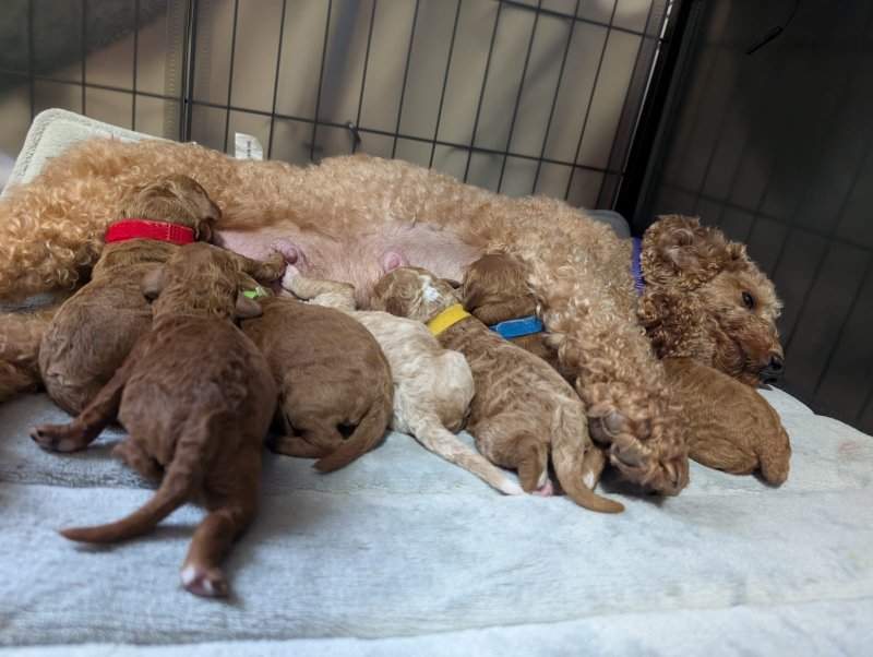 Mum, “Ruby” is our cherished 3-year-old family pet. She is a stunning red block KC miniature poodle with a sweet, funny and loving temperament, and she has taken to motherhood beautifully.
