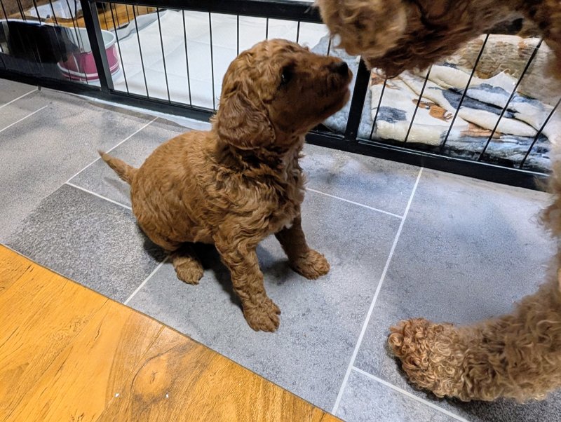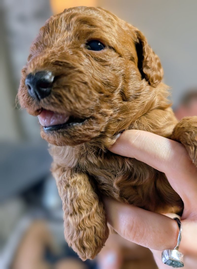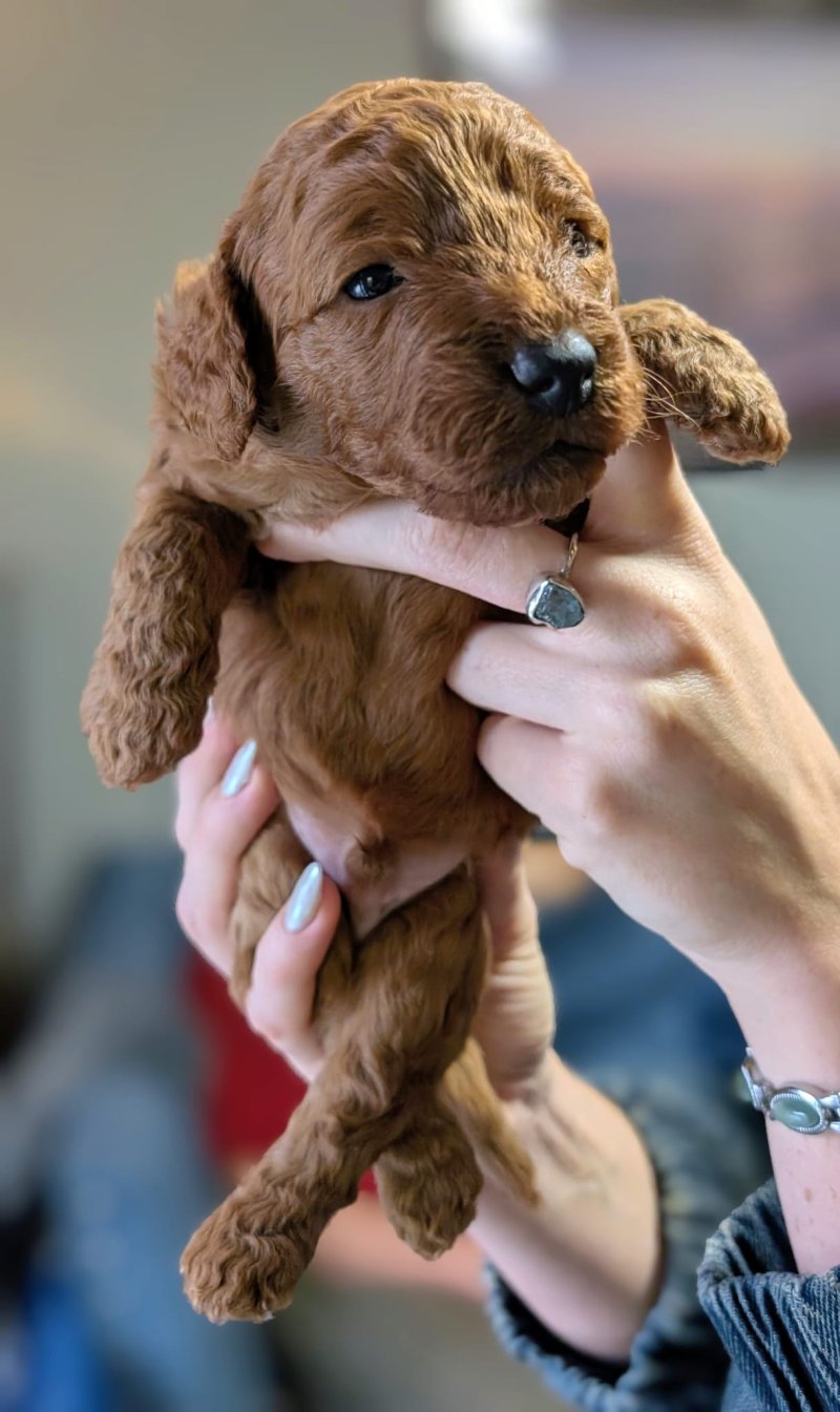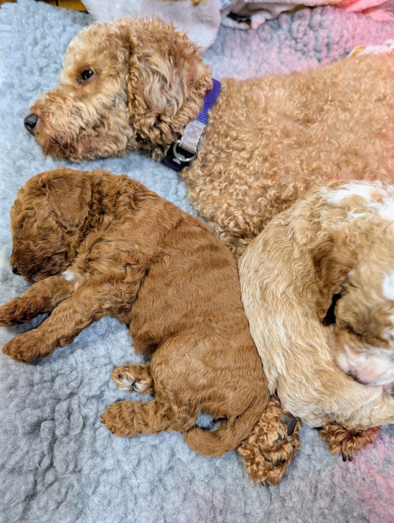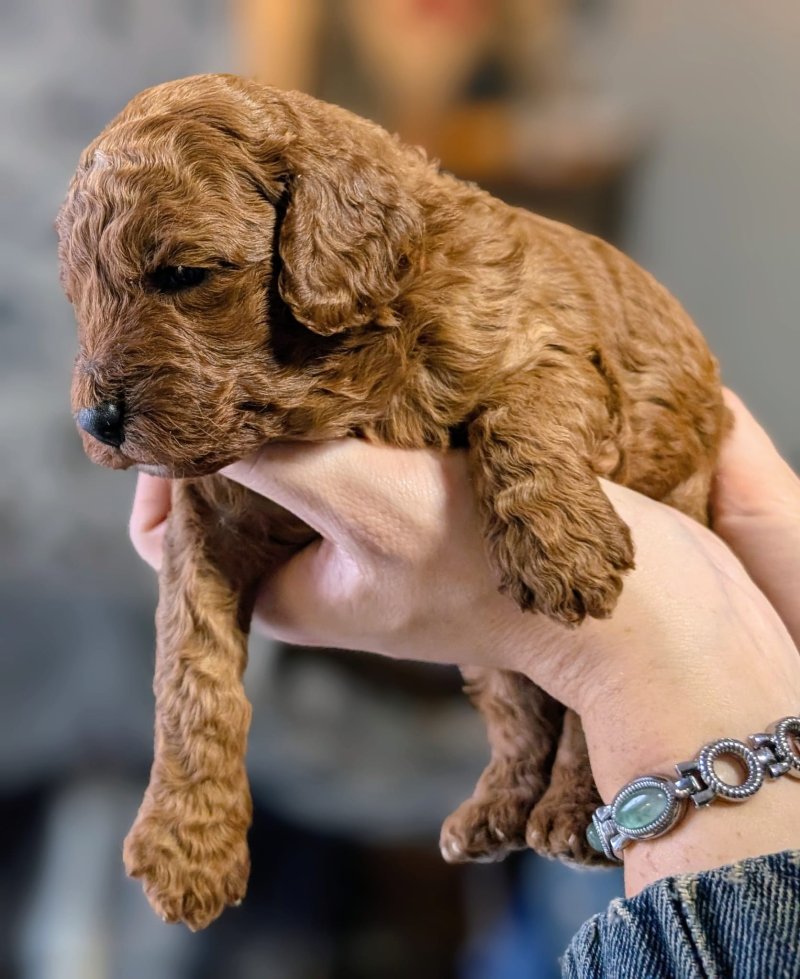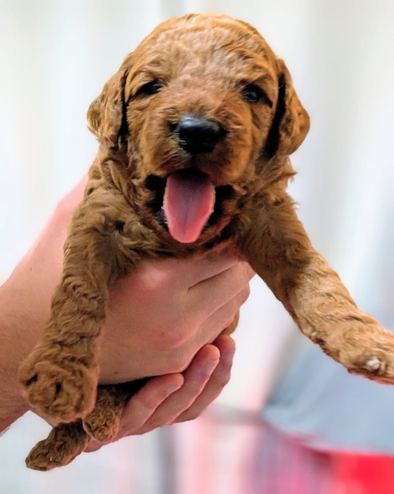 Mum, “Ruby” is our cherished 3-year-old family pet. She is a stunning red block KC miniature poodle with a sweet, funny and loving temperament, and she has taken to motherhood beautifully.