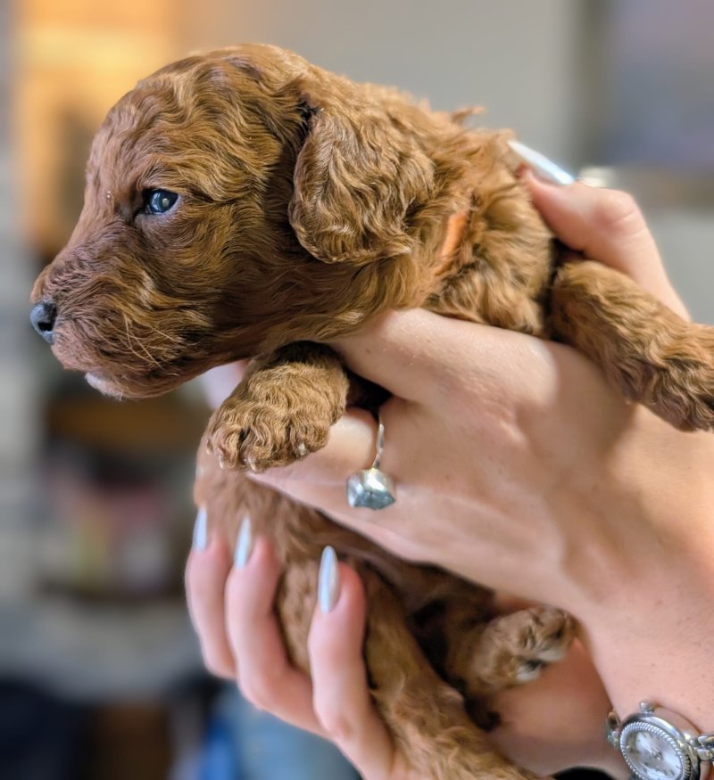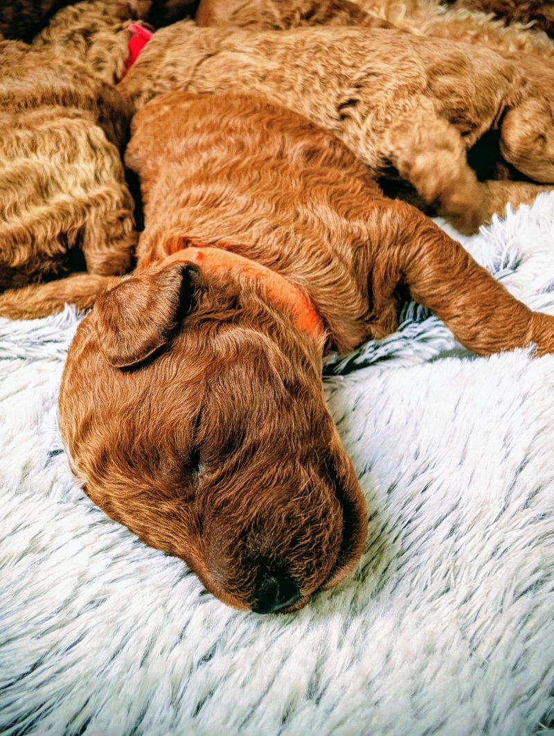 AVAILABLE - Puppy 1 - ORANGE BAND - Deep Red - has a cute white patch on her forehead and chest area.