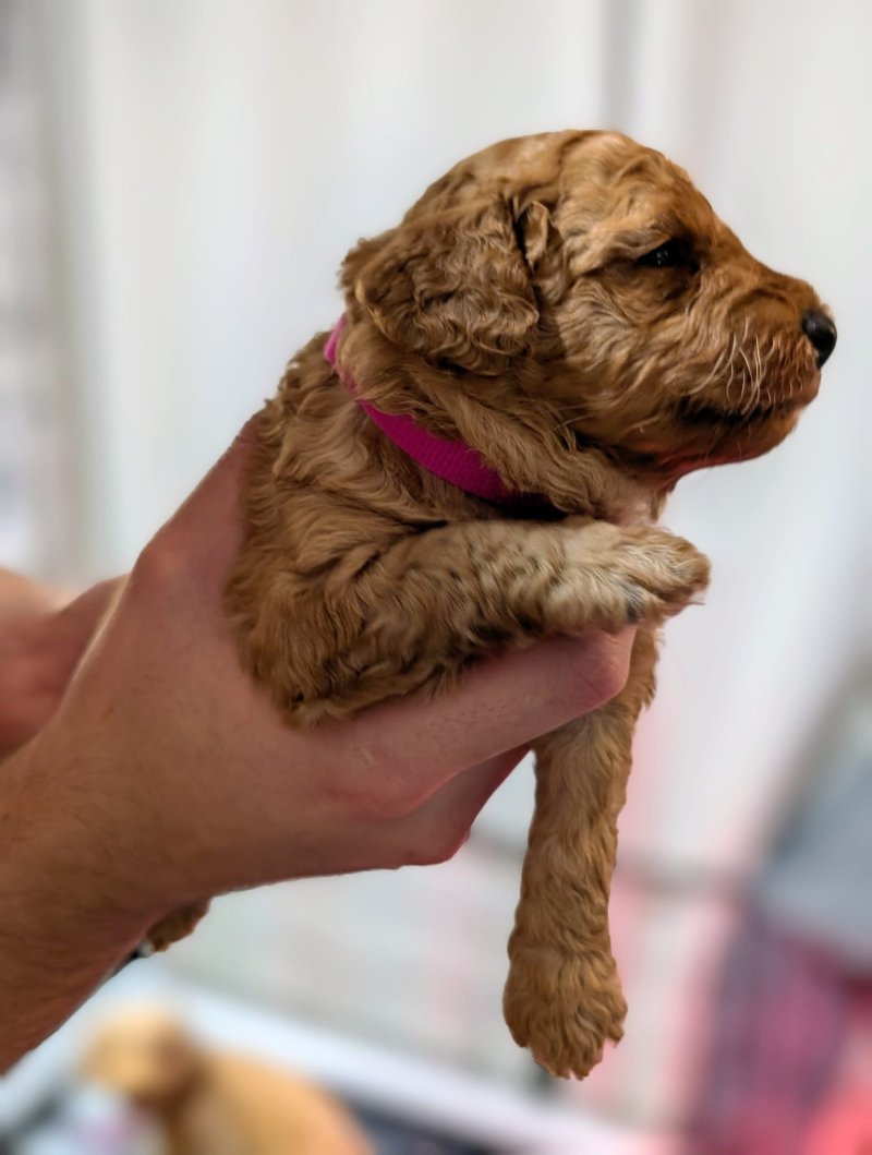 RESERVED - Puppy 6 - PINK BAND - Apricot colour with a small white spot on her chest.