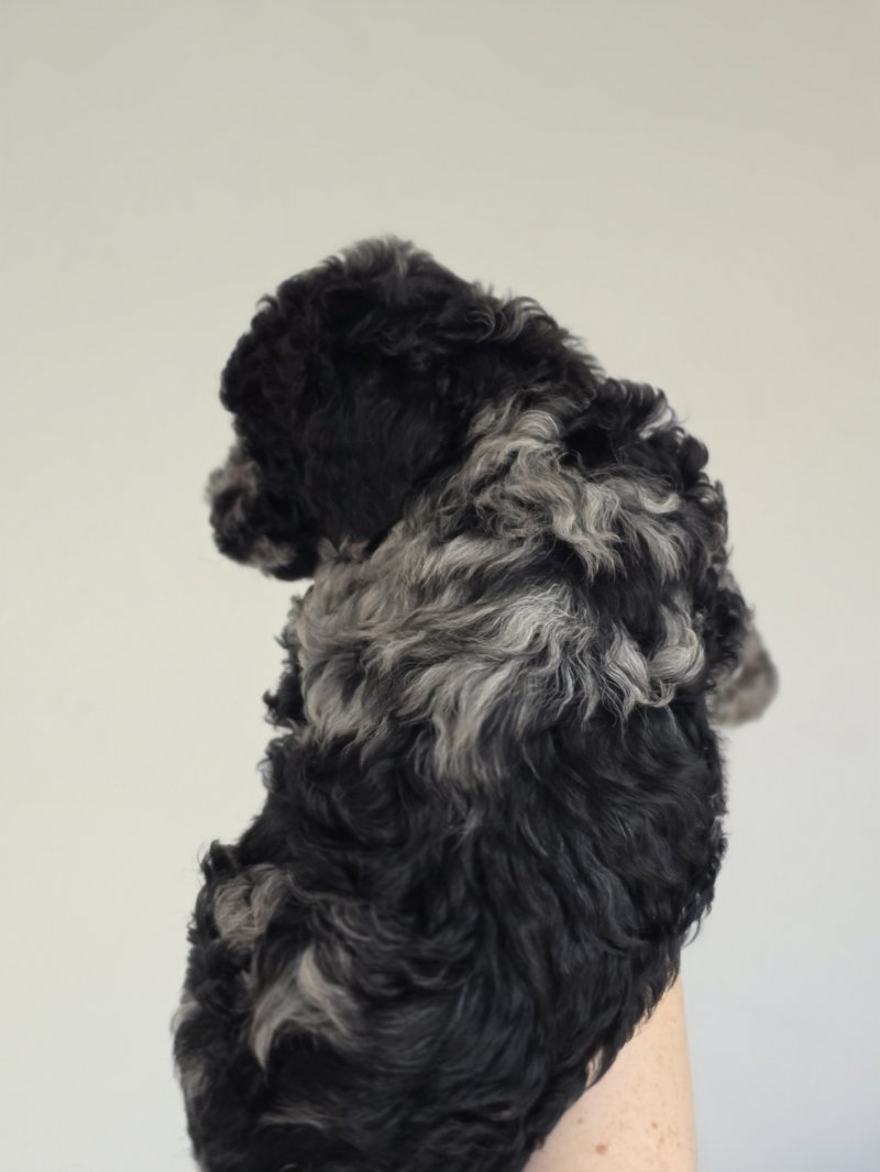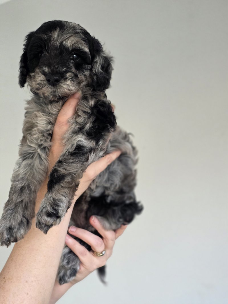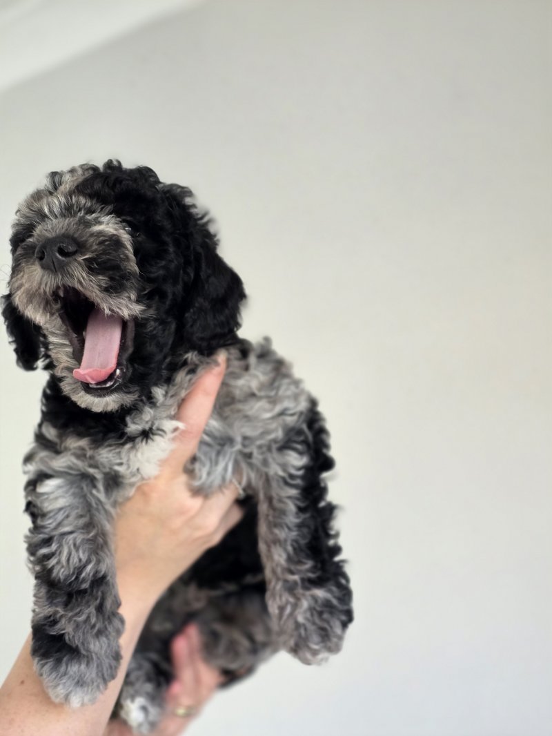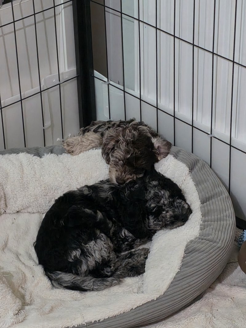 Dad is an F1 schnoodle, his mum was miniature schnauzer and his dad was a miniature poodle.