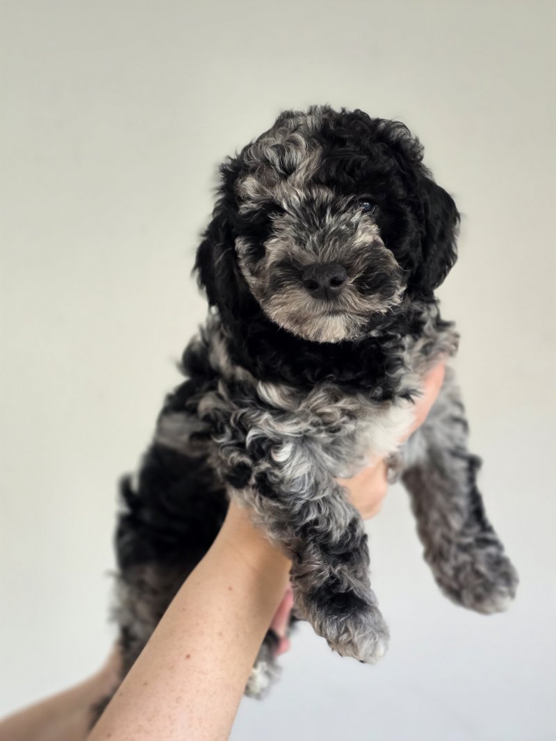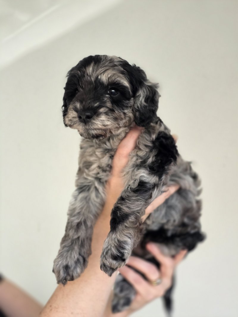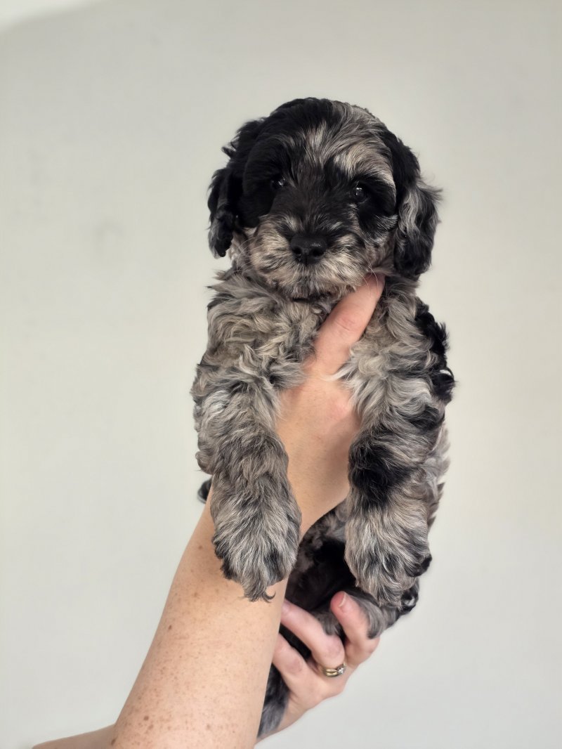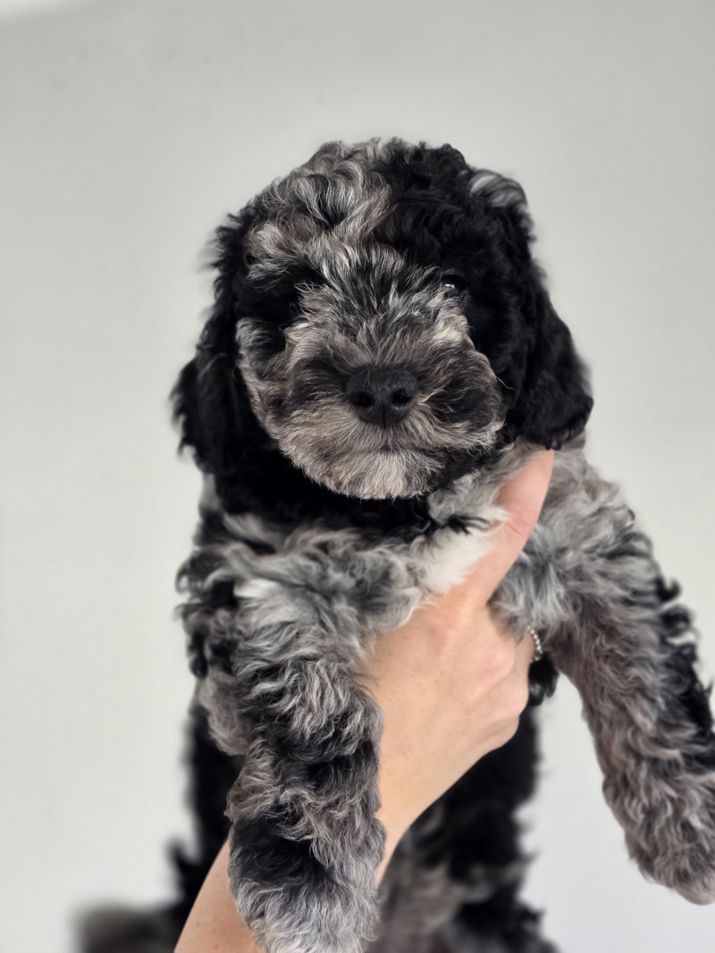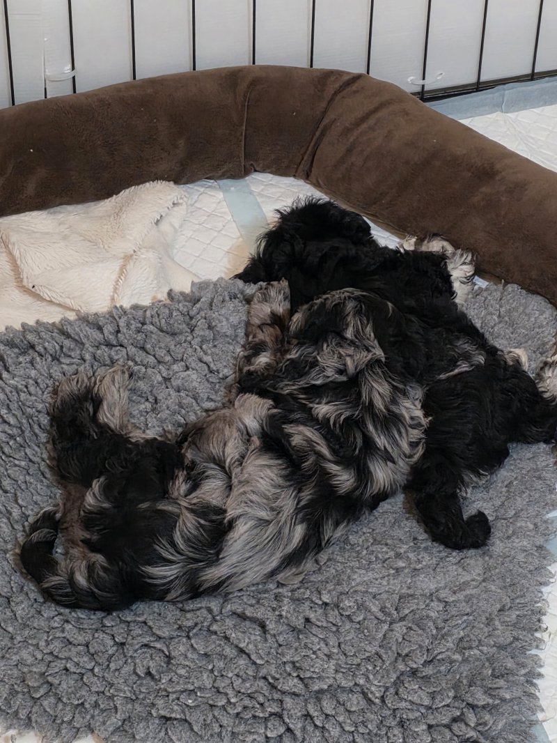 Dad is an F1 schnoodle, his mum was miniature schnauzer and his dad was a miniature poodle.