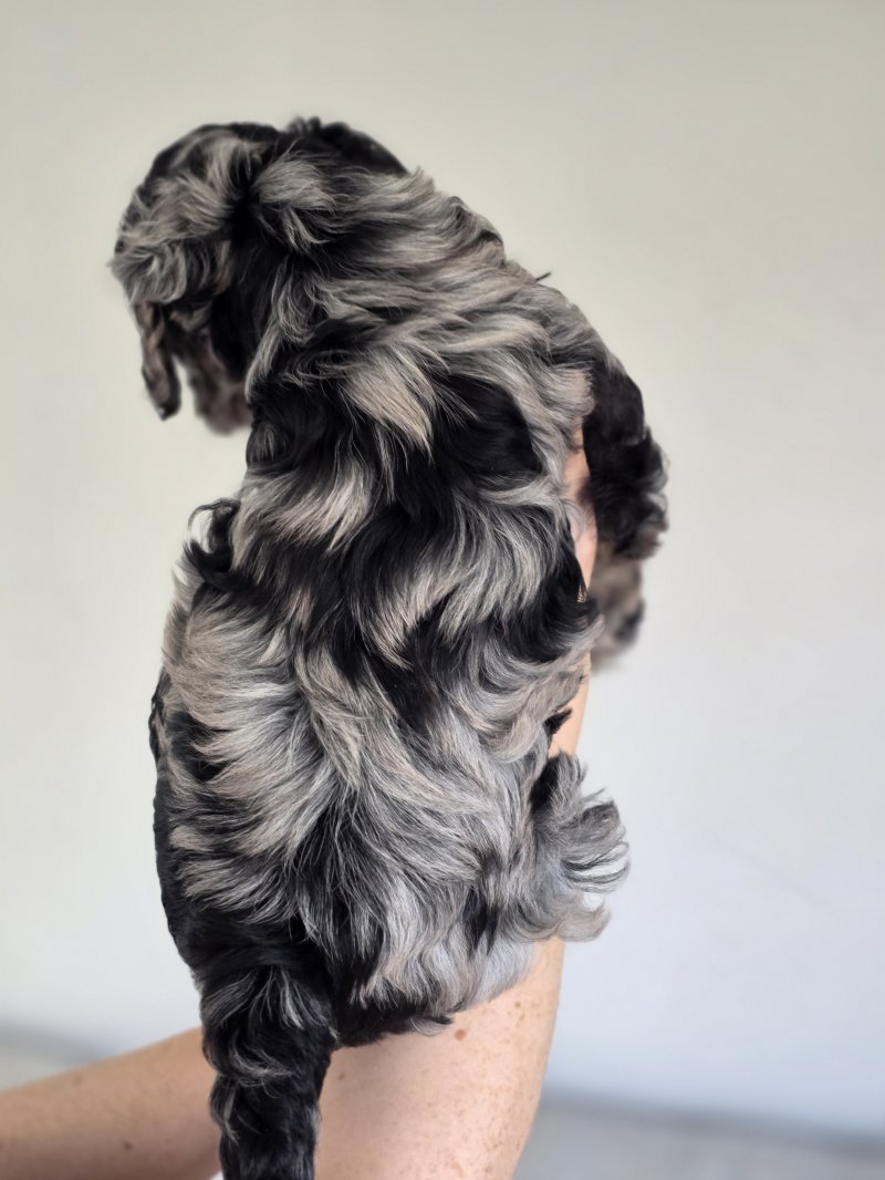 Mum is an F1b apricot schnoodle, her mum was a miniature schnoodle and her dad a red toy poodle.