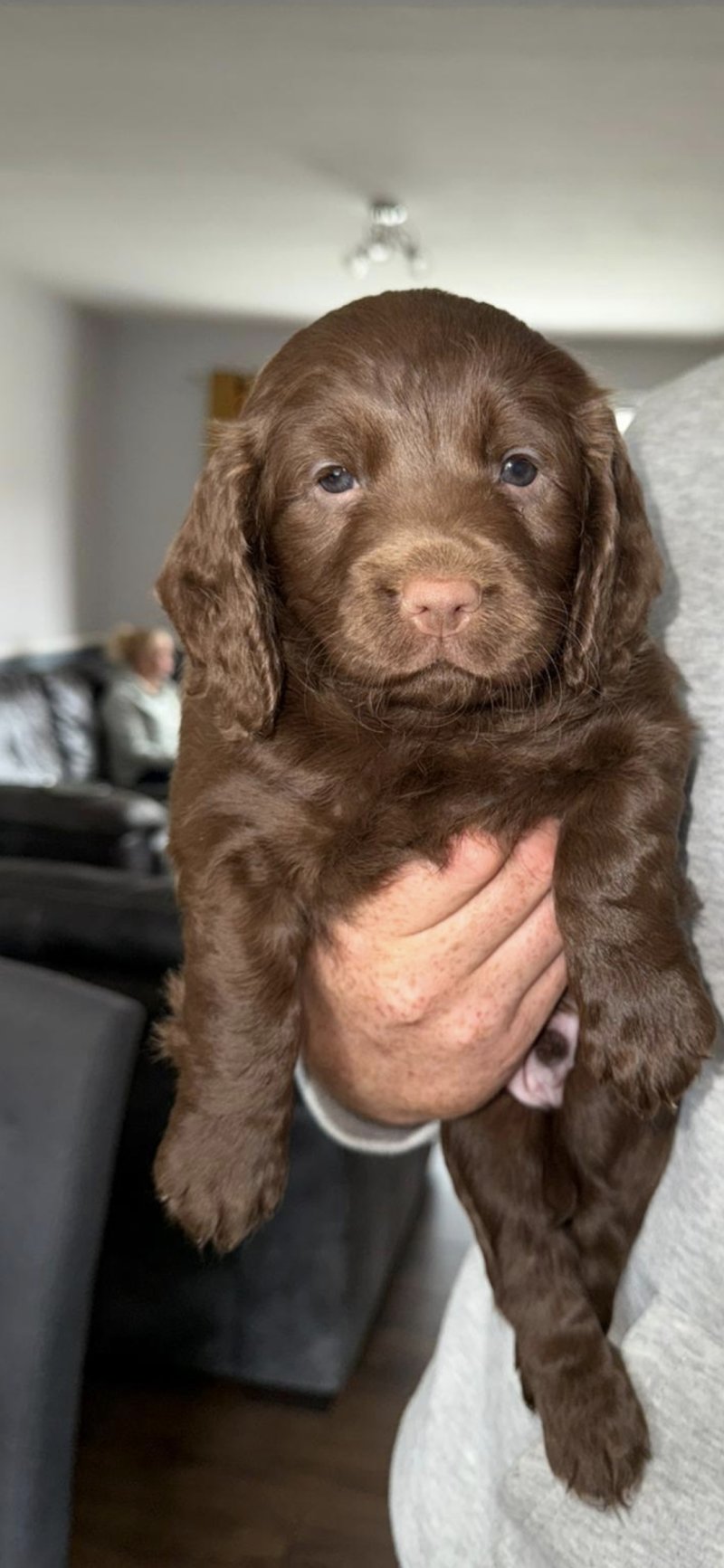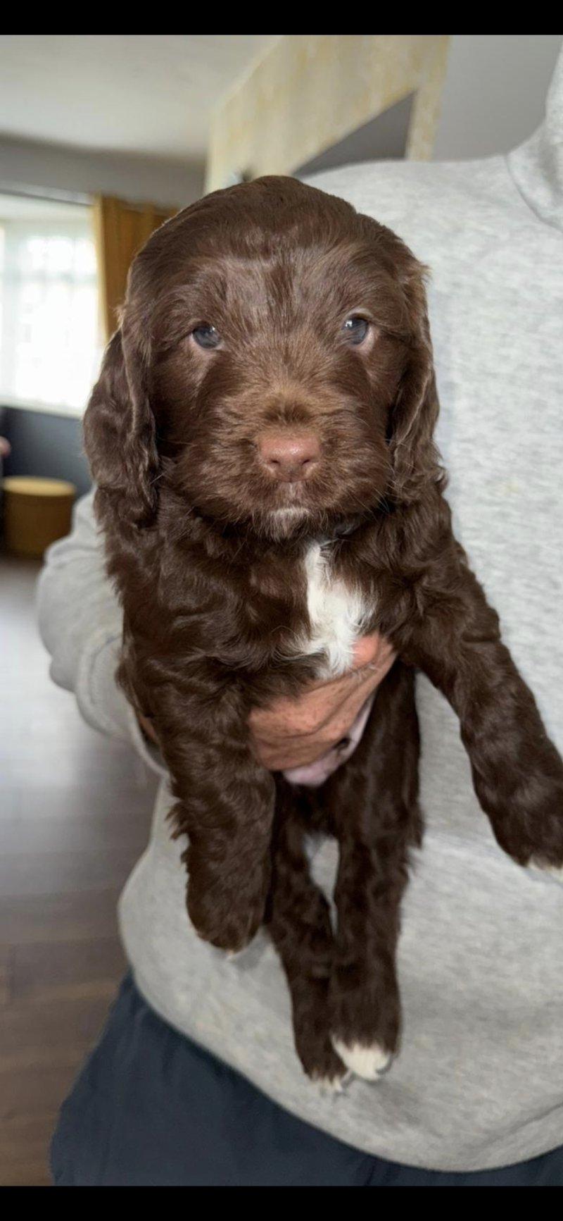 We have 2 adorable liver boys left from a mixed colour litter of 6 pups . Mam is a sprocker dad a cockapoo . Puppies are amazing all very alert and very attentive. Doing great x SOLD TO NEW FOREVERHOMES X