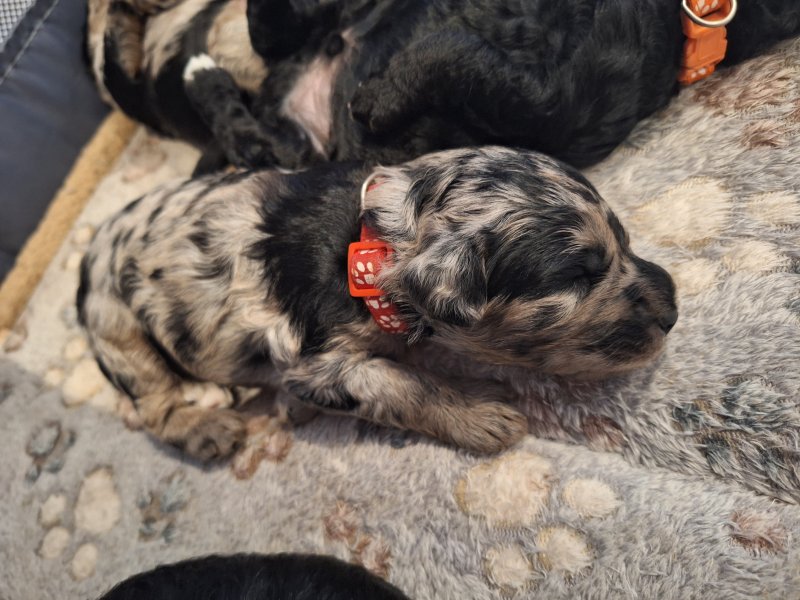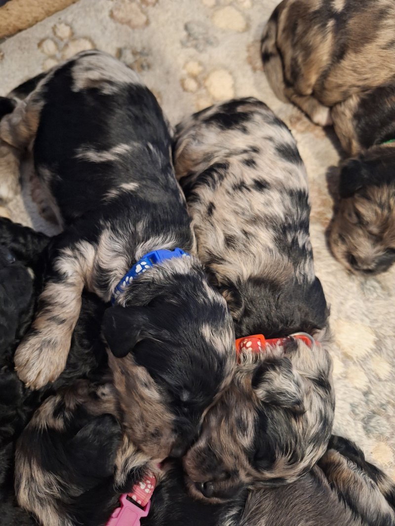 We are very proud to announce our beautiful family dog has had a litter of Sproodles. We have 2 beautiful full brown/black puppies and 3 beautiful rare merle puppies with stunning colours