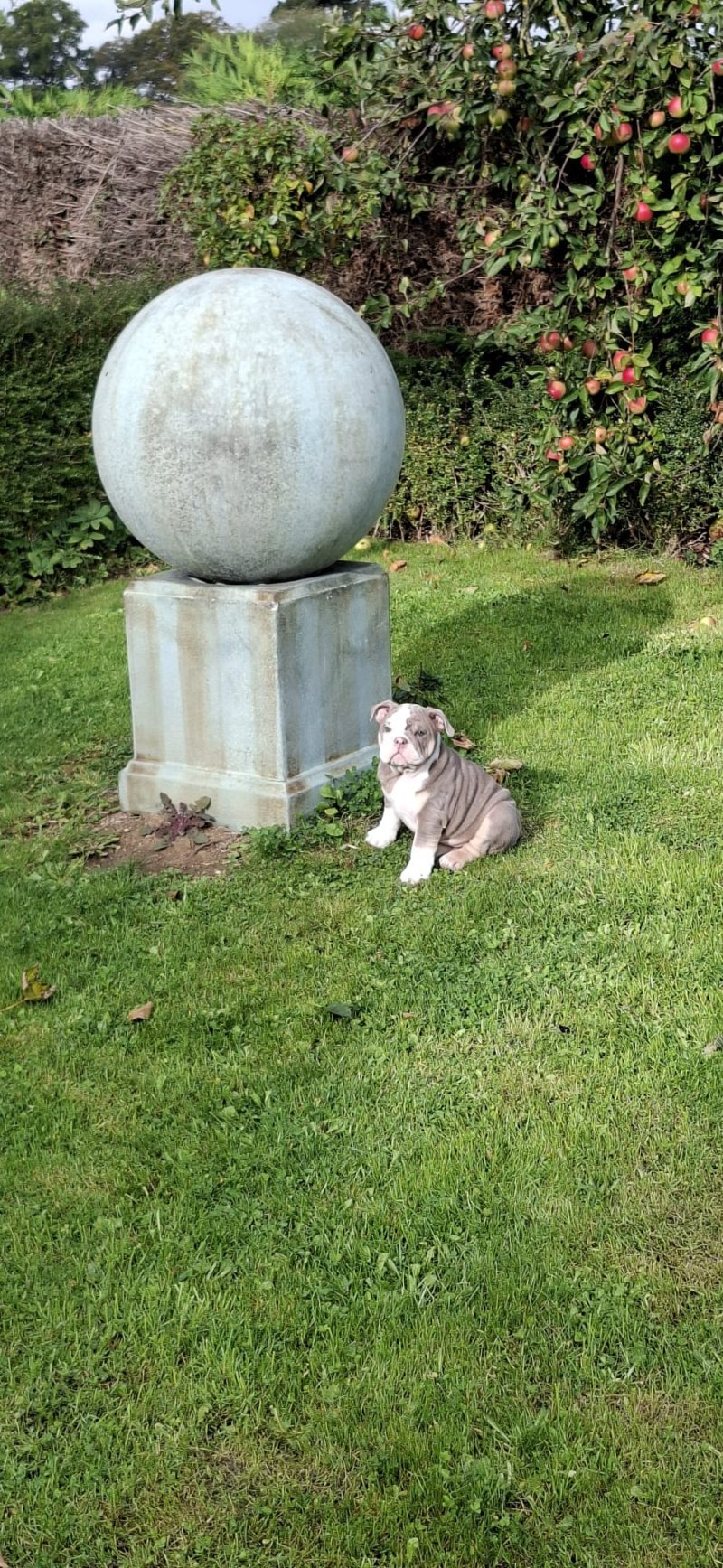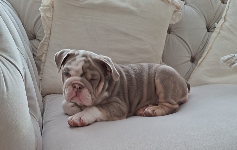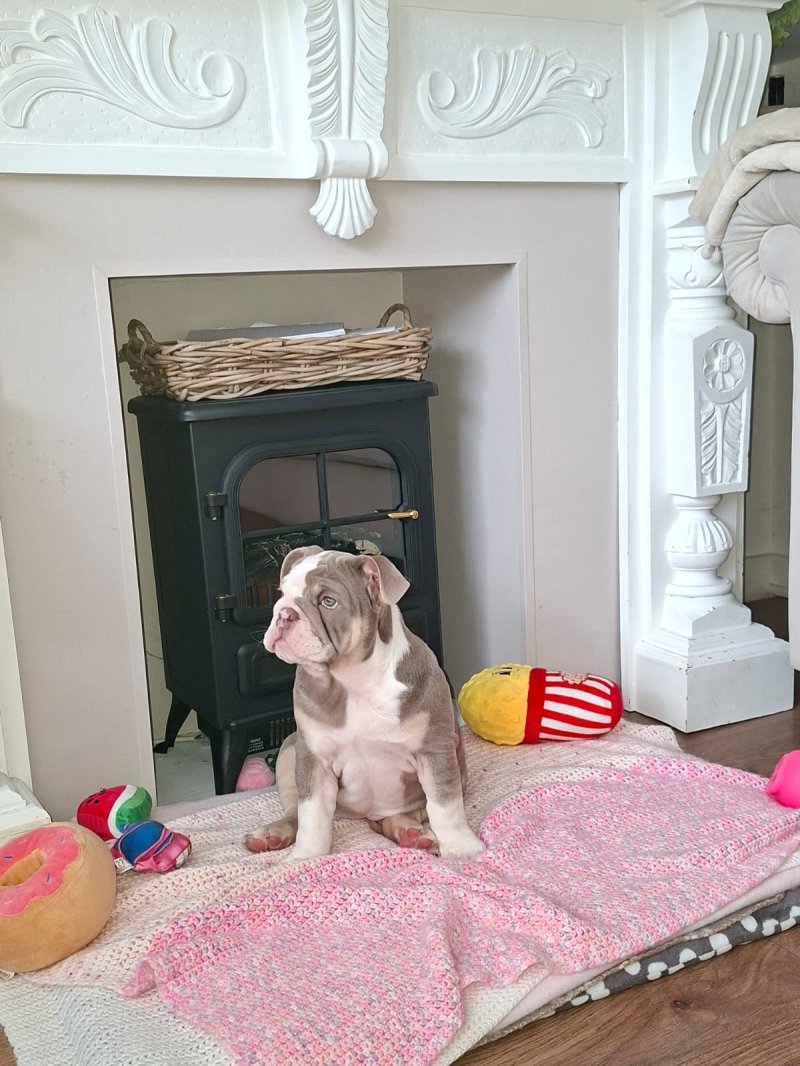 British Bulldog, Violet💜, nearly 4 months old, having to rehome, through no fault of her own. Her colour is lilac & tri. She comes from a massive generational blood line! Dating back 5 generations on documentation. Violet's mother Margo is the daughter of the British Bulldog Mr.Muscle 💪, grand-daughter of Mr.Benchpress. Dad is the one and only legend Top Boy! City lines through and through. Mumbai the king and messiah to name a few. His pedigree is stacked! 🦁 We got Violet💜 at nearly 10 weeks old, but due to my son who has ASD has not taken to her as much as we thought he would, he doesn't like how she is getting bigger as he doesn't cope well with change. 😔 We have had to come to the heartbreaking decision to rehome Violet as we feel it would be best for Violet to go to another loving home rather then feeling rejected, however we will only let Violet💜 go to the right family.🫶 Violet💜 is a confident, playful little girl, whom loves nothing but cuddles and fuss.❤️ She loves exploring nature and going on walks over fields, she also loves running around the garden chasing leaves. 🍂 She is fully KC registered, injections are all up-to-date, she is microchiped, she has had a health check by the vet and all has came through green.💚 She is fully house trained, she can also do plenty of commands I.e paw, sit, come, stay and the latest one is lie down. 🐾 Please only message if you are trustworthy and are interested on taking in a loving puppie whom you can add to your family and shower with all your love. 💞